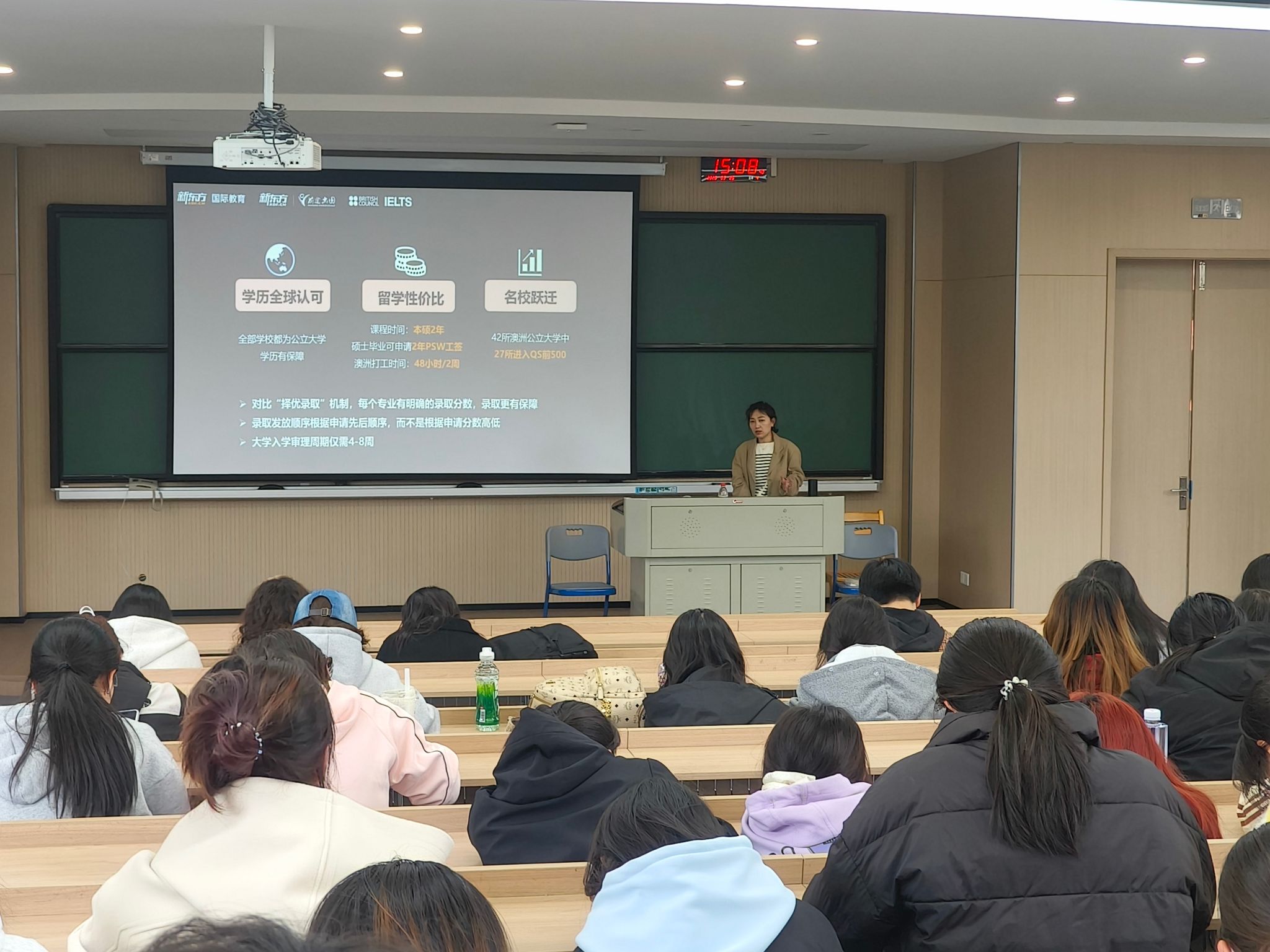 3月26日,唐人博彩论坛 邀请新东方教育科技集团讲师王璐来举办留学申请专题讲座,围绕出国留学的价值与规划进行系统讲解,唐人博彩论坛 120余名本科生到场参加。
